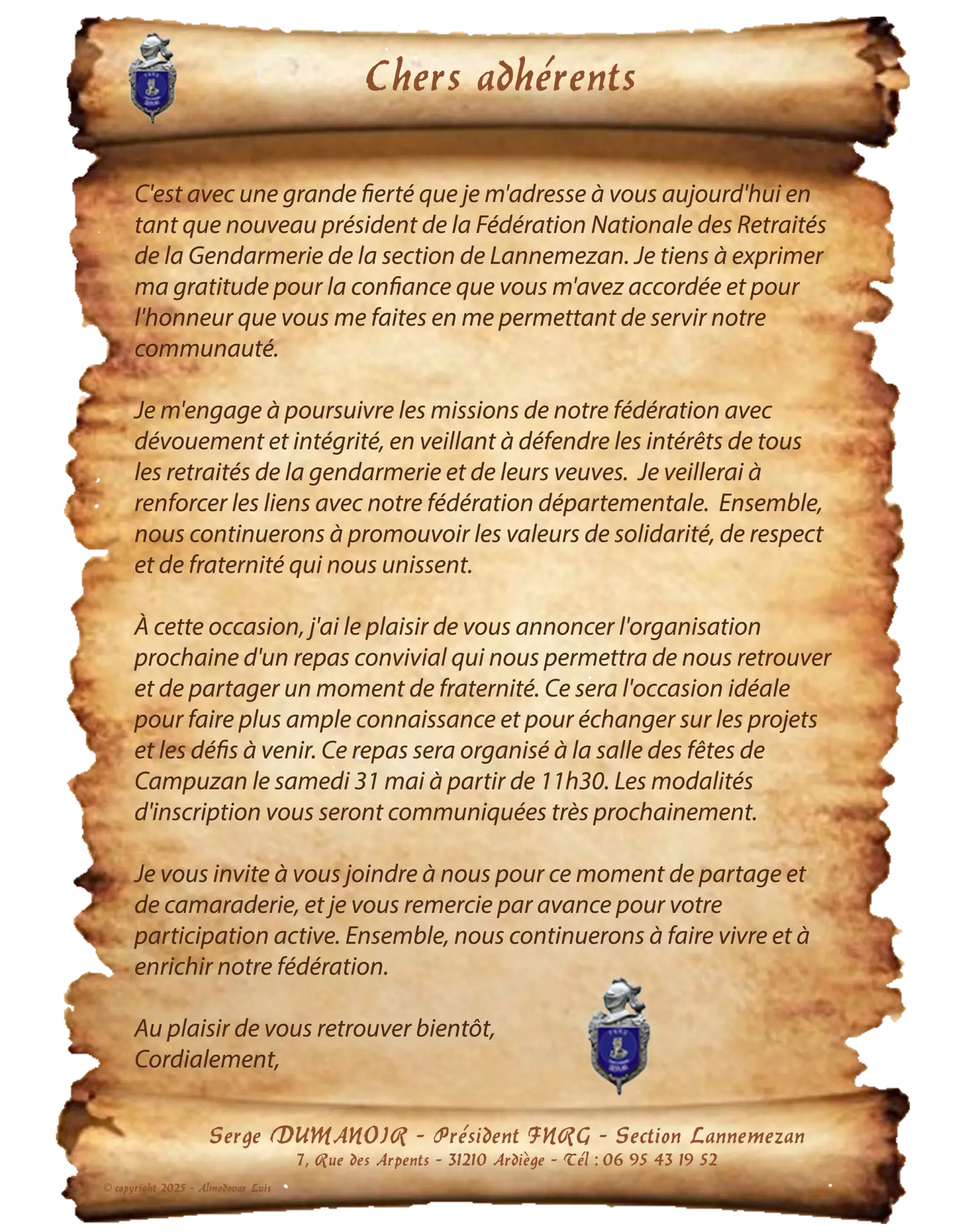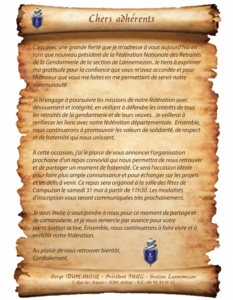 La F.N.R.G et plus particulièrement la F.D.R.G 65 et la section de Lannemezan, souhaitent au colonel, à son épouse et à ses enfants la bienvenue dans notre belle région Pyrénéenne.